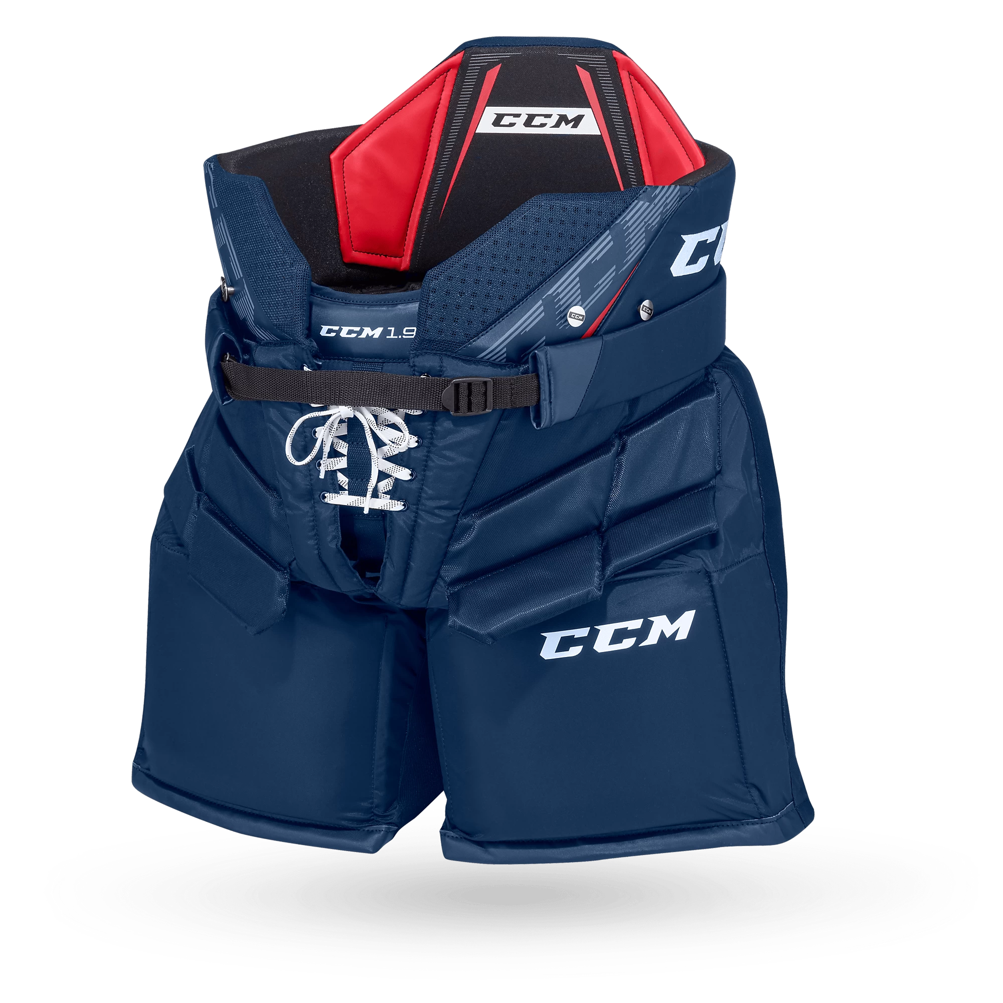 The CCM 1.9 Goalie Pants are available in Intermediate sizes Small through Large, and in Black and Navy.