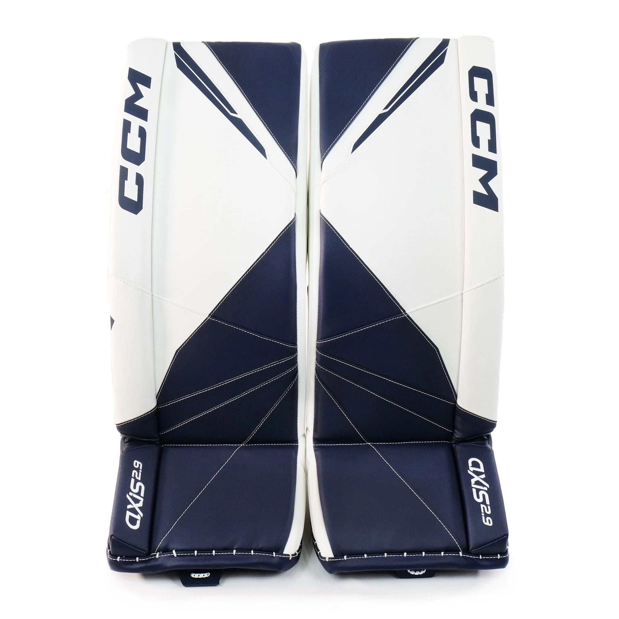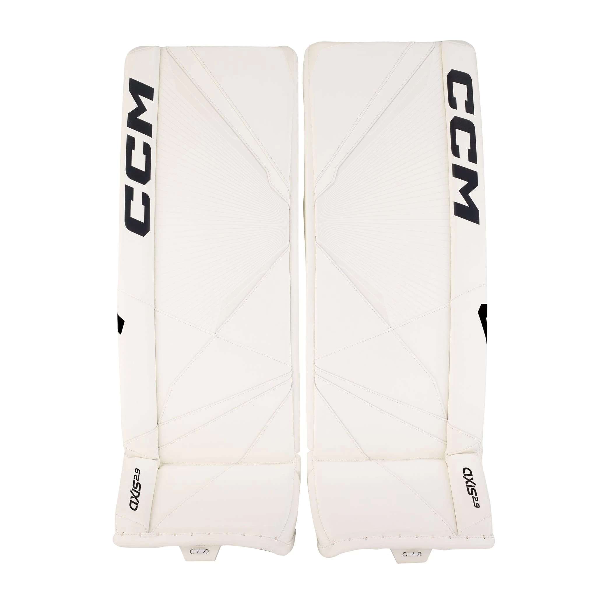 The CCM Axis 2.9 Intermediate Goalie Leg Pads come in 30+1, 31+1, and 32+1 sizes, and the following colourways: Boston Bruins, Chicago Blackhawks, Detroit Red Wings, Montreal Canadiens, Toronto Maple Leafs, White, White/White/Black/Black, and White/White/Navy/Navy.