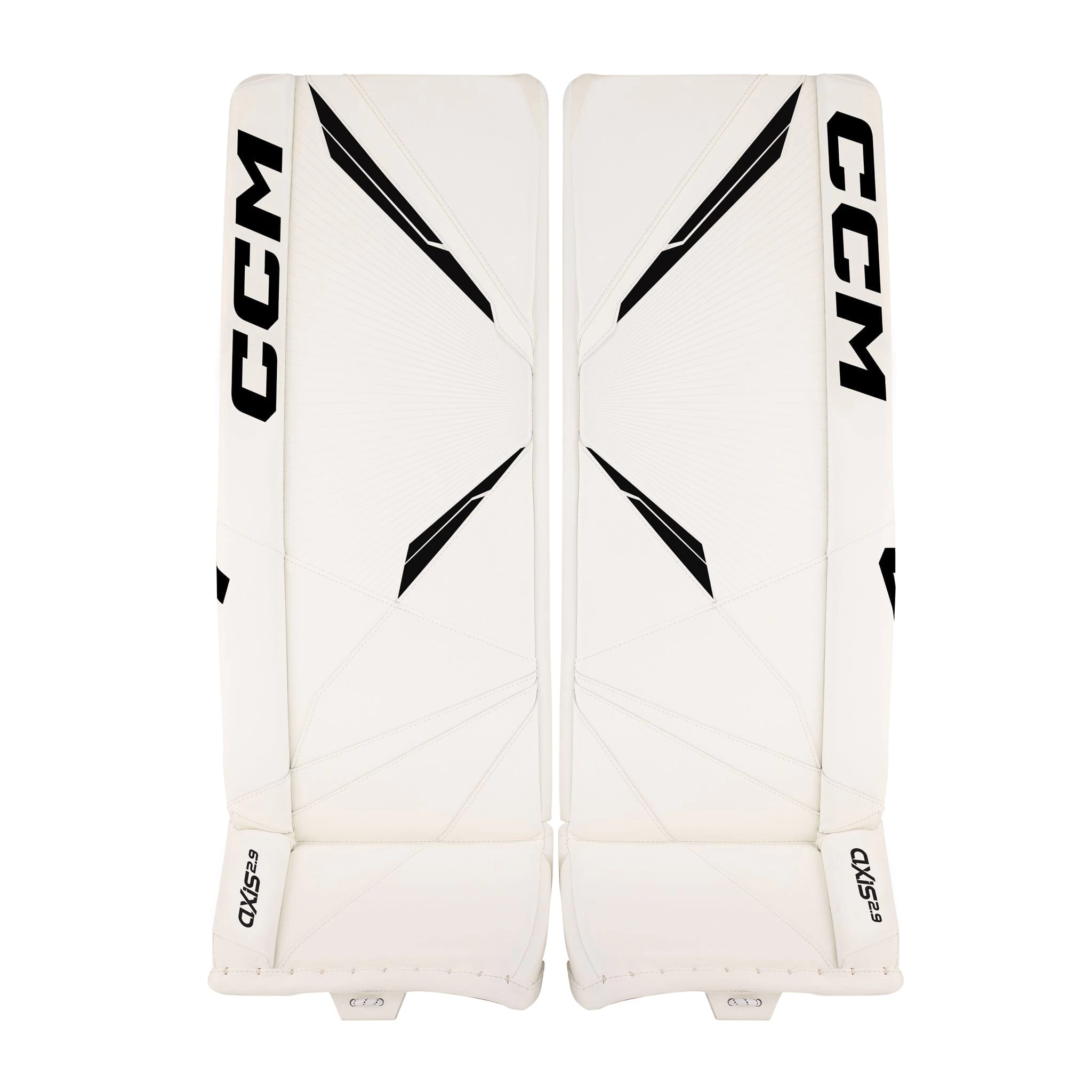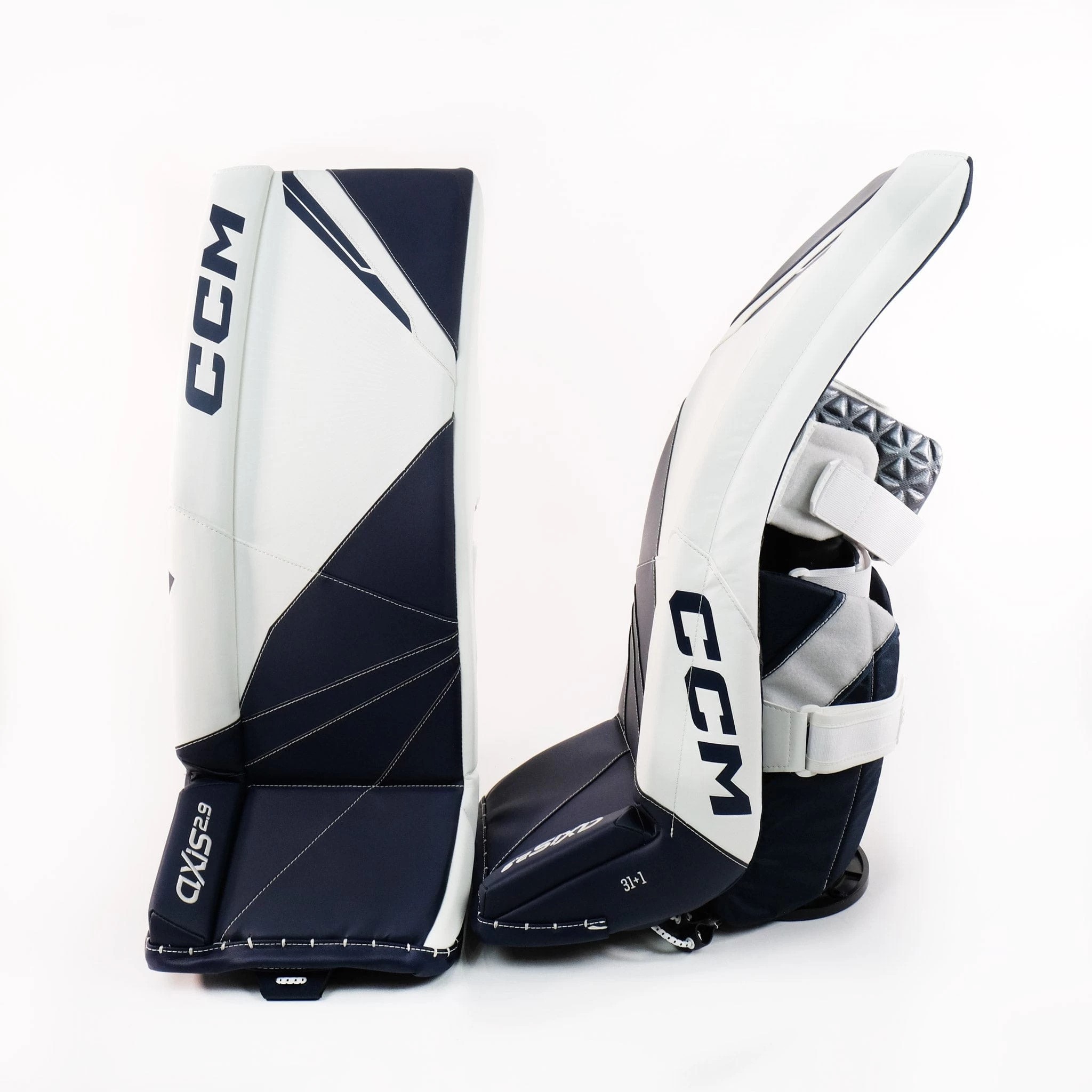 The CCM Axis 2.9 Senior Goalie Leg Pads come in 33+1, 34+1, 34+2, and 35+2 sizes, and the following colourways: Boston Bruins, Chicago Blackhawks, Detroit Red Wings, Montreal Canadiens, Toronto Maple Leafs, White, White/White/Black/Black, and White/White/Navy/Navy.