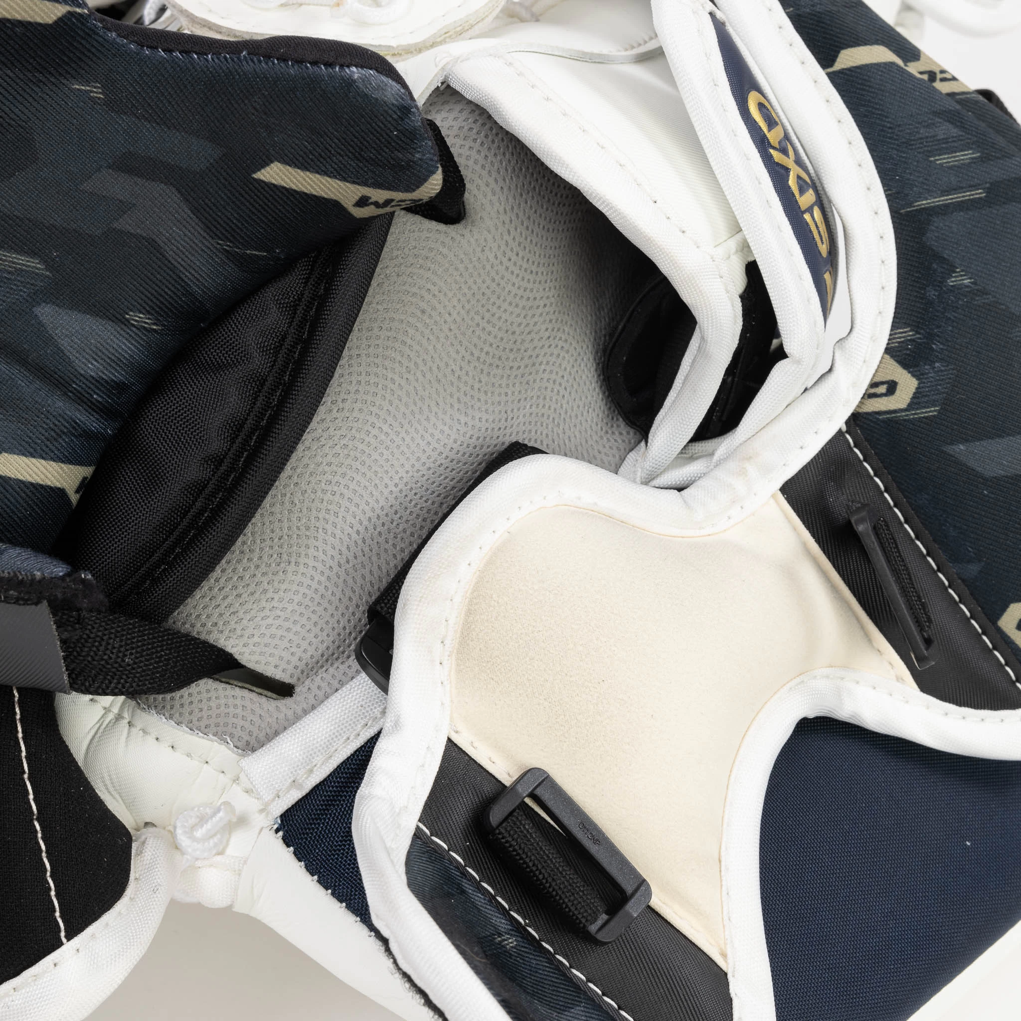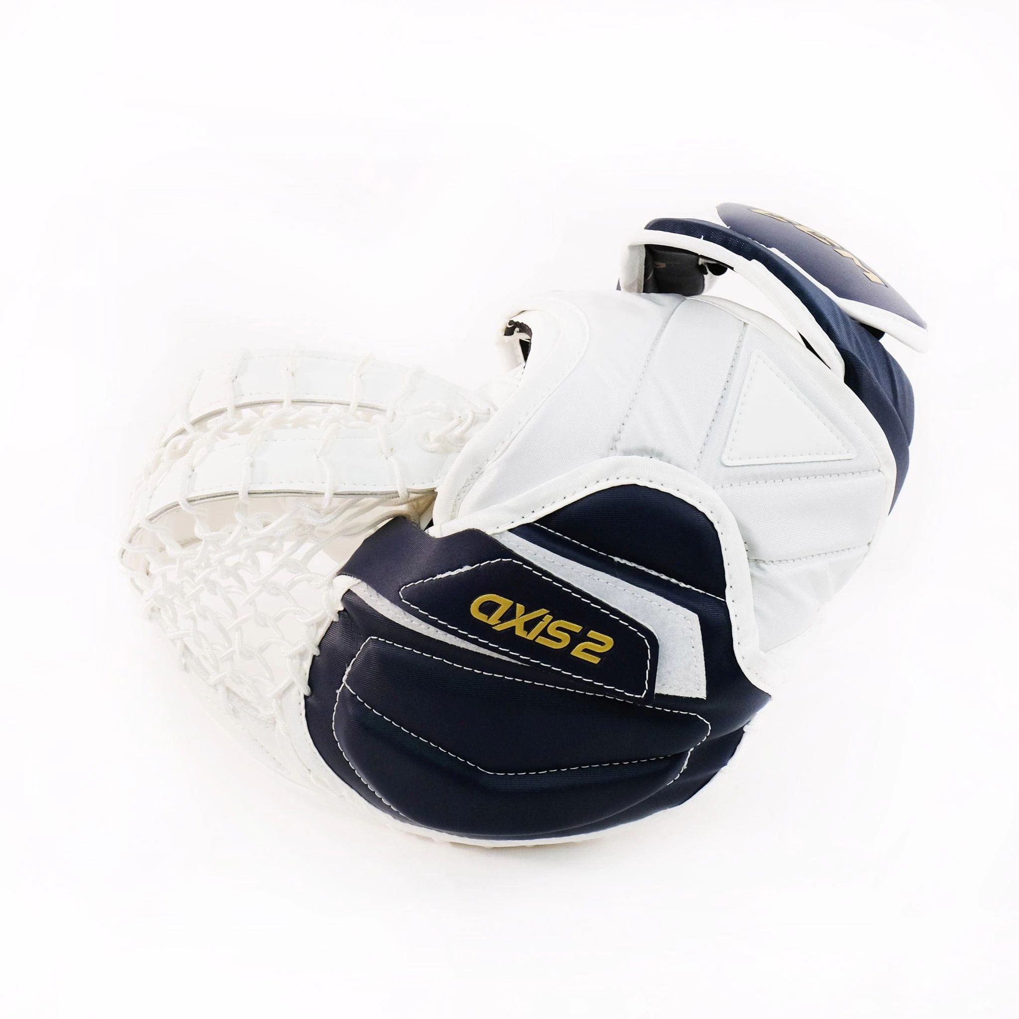 The CCM Axis 2 Senior Goalie Catcher comes in sizes 33+1, 34+1, 34+2, and 35+2, and the following colourways: White and White/Navy/Red/Gold.