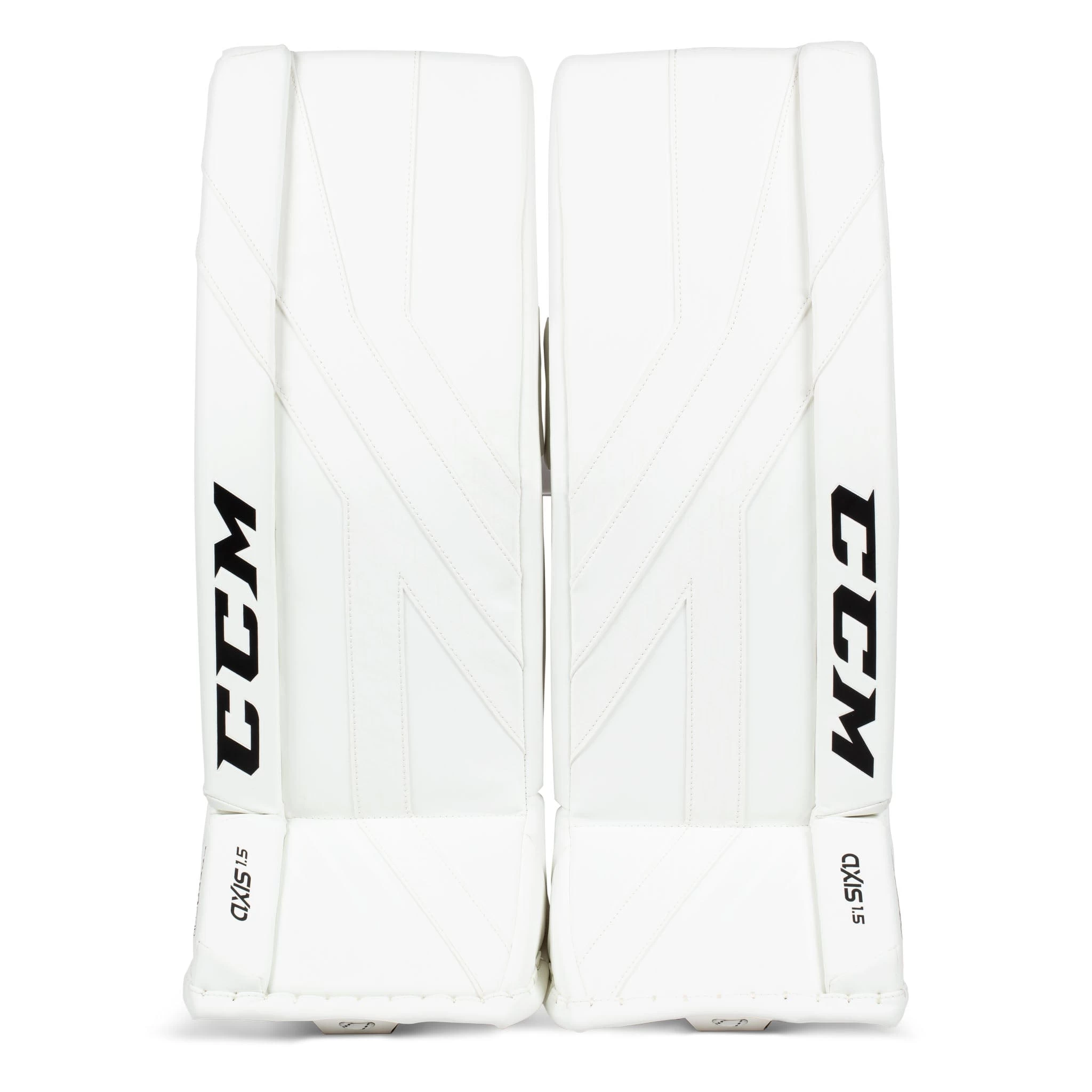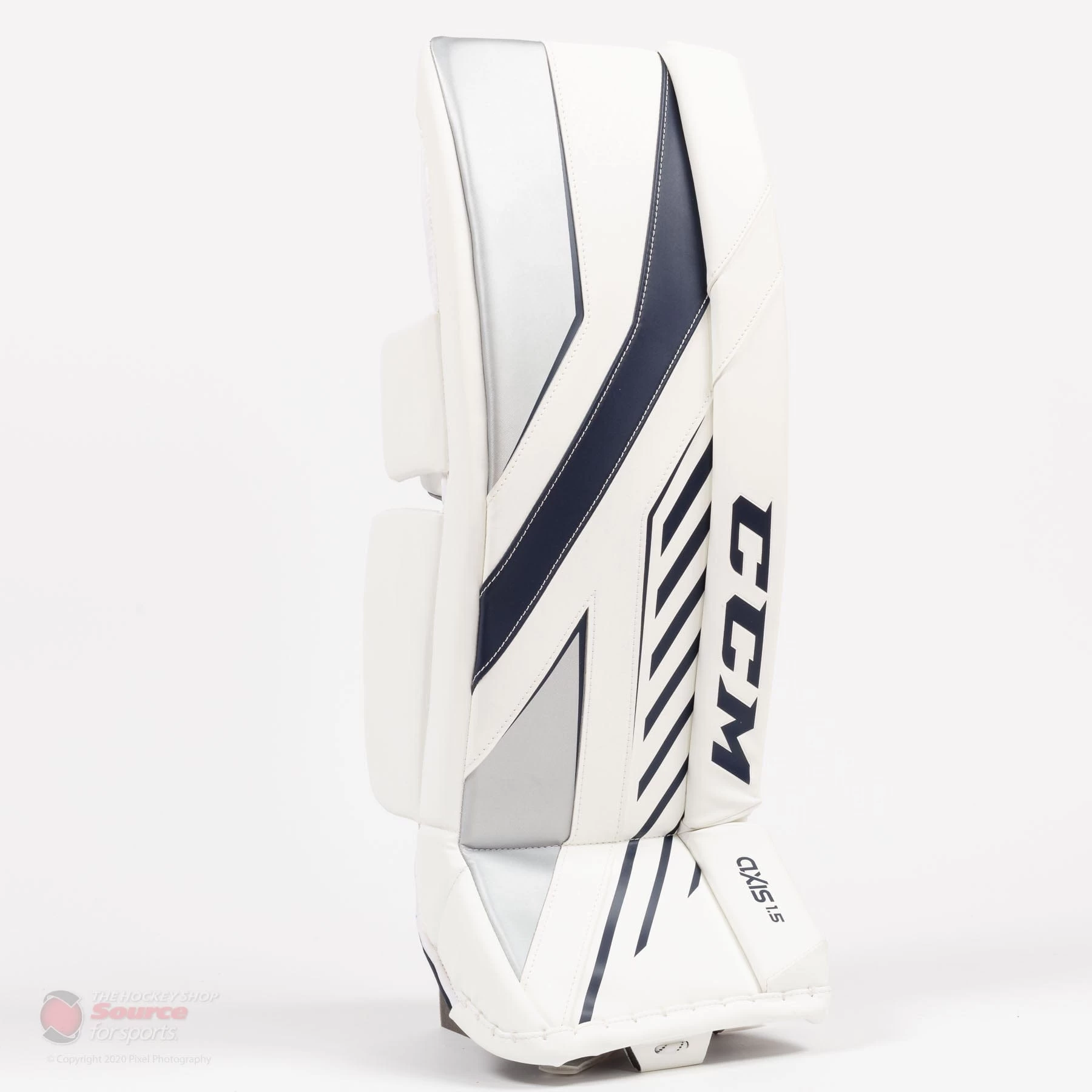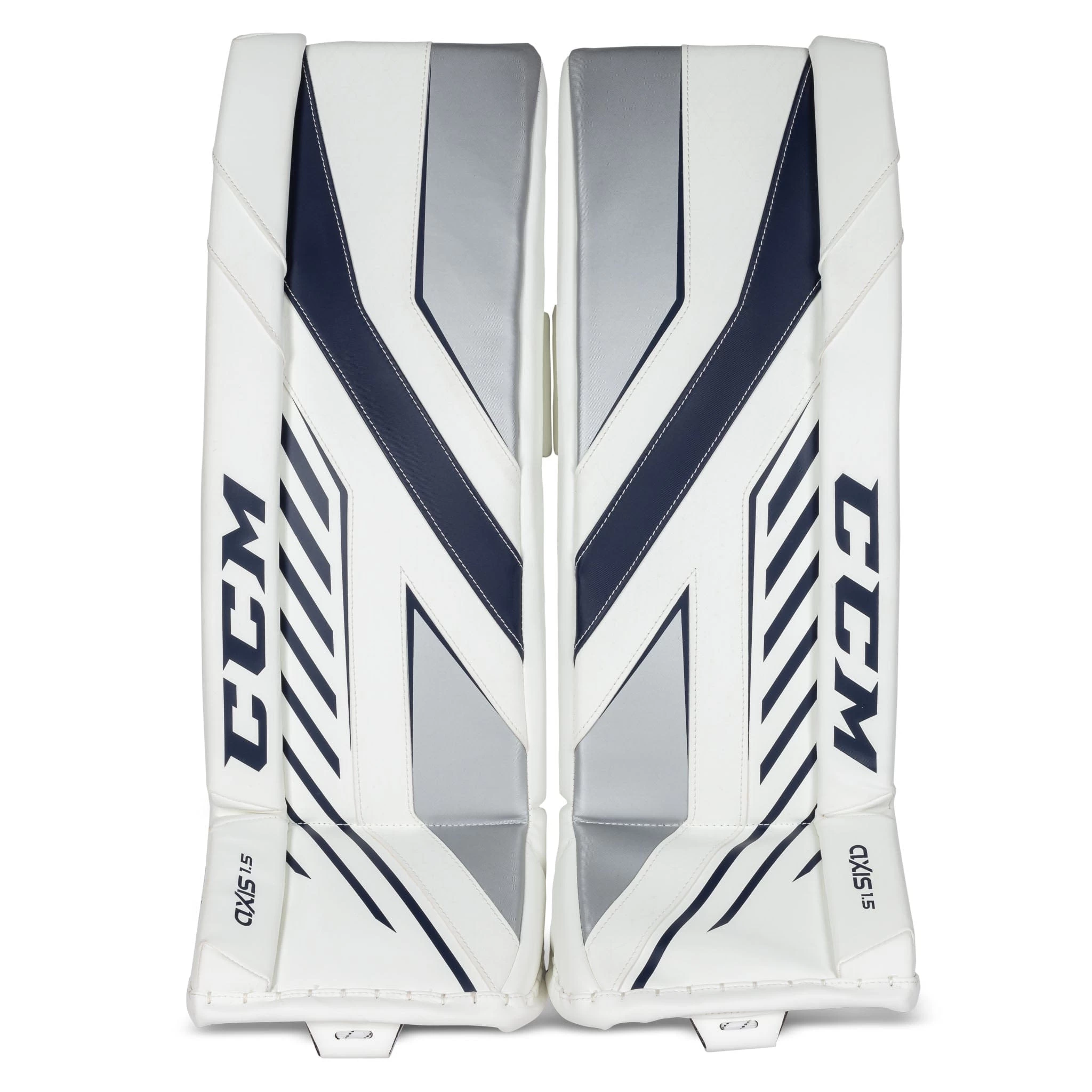 The CCM Axis 1.5 Leg Pads come in Black/Black/Black/Silver, Chicago Blackhawks, Detroit Red Wings, Montreal Canadiens, Toronto Maple Leafs, All White, White/White/Navy/Silver, & White/White/Black/Black and are offered in 26+1, 28+1 and 30+1 junior sizing.