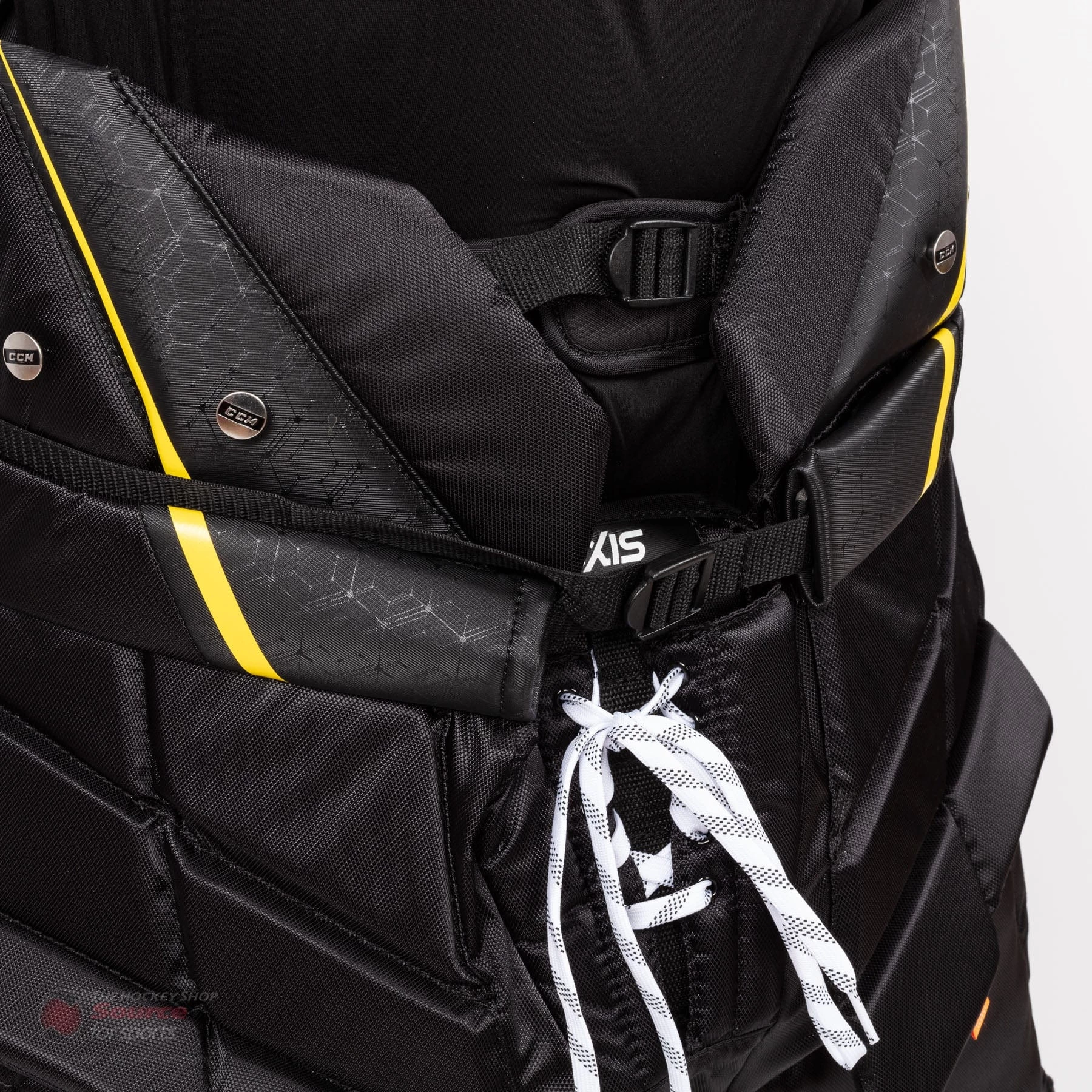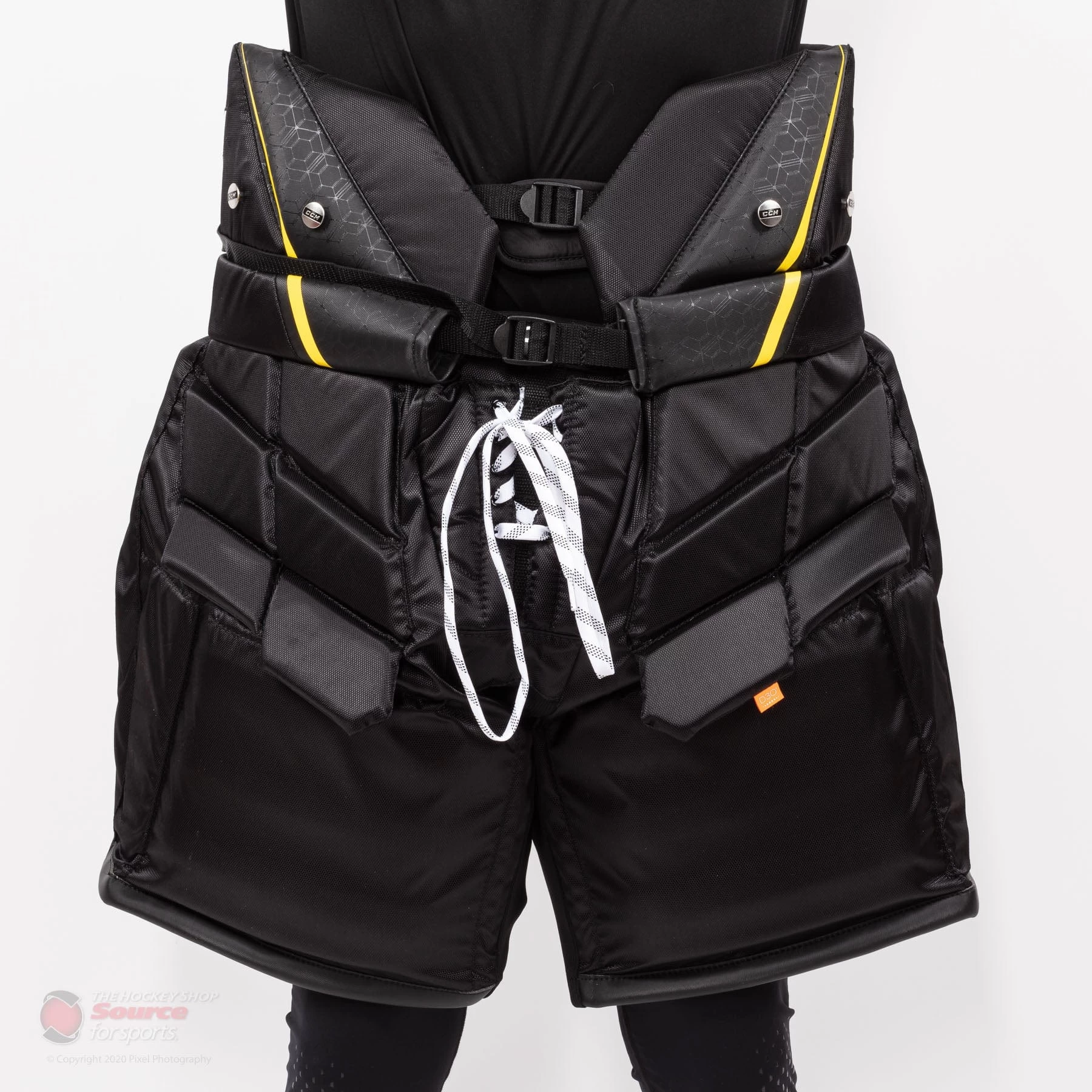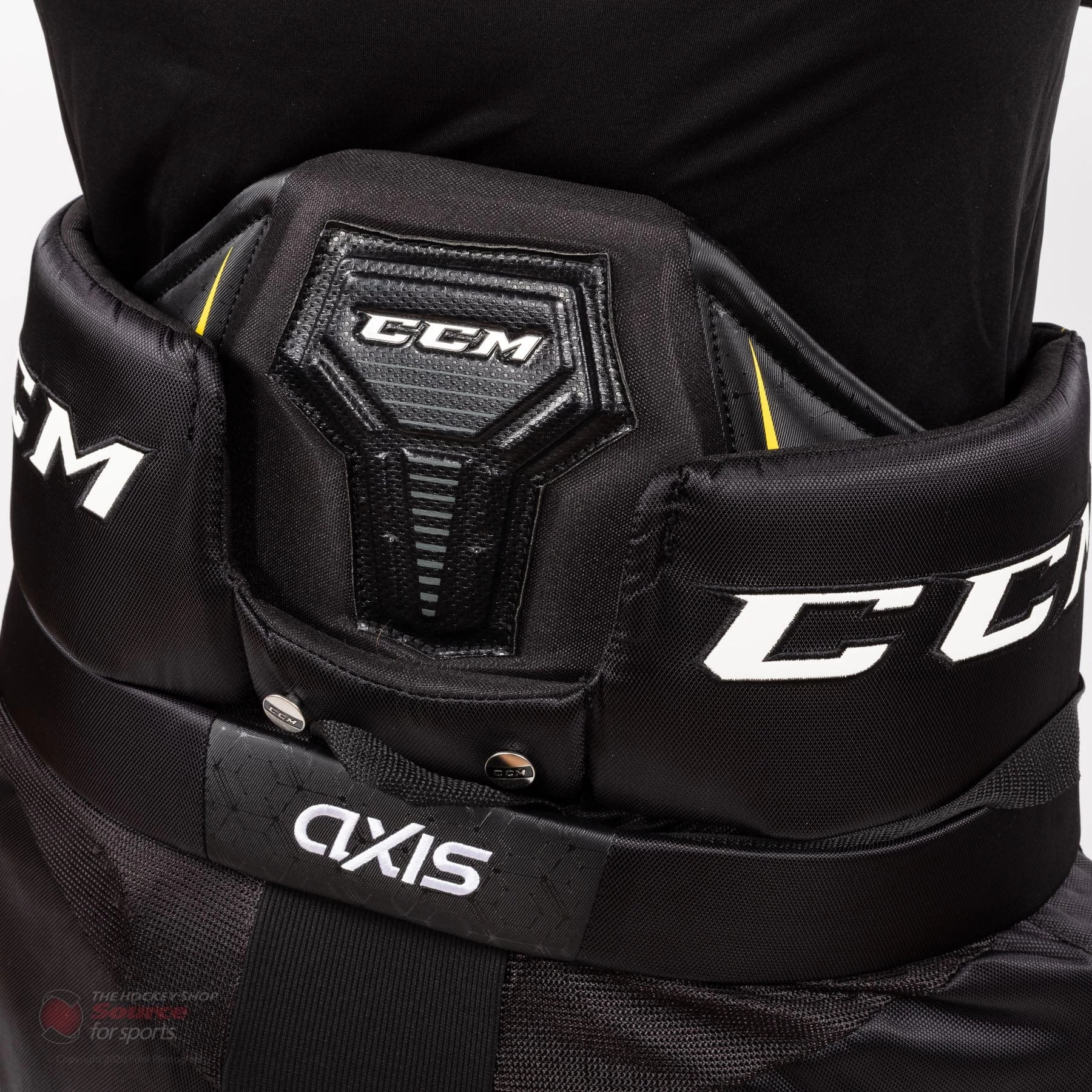 The CCM Axis Goal Pant is the new top of the line model for 2020. The pant features a resigned groin and upper thigh segmented protection pieces with D30 impact resistant foam. This segmentation is new for 2020 and is designed to increase protection coverage without sacrificing mobility