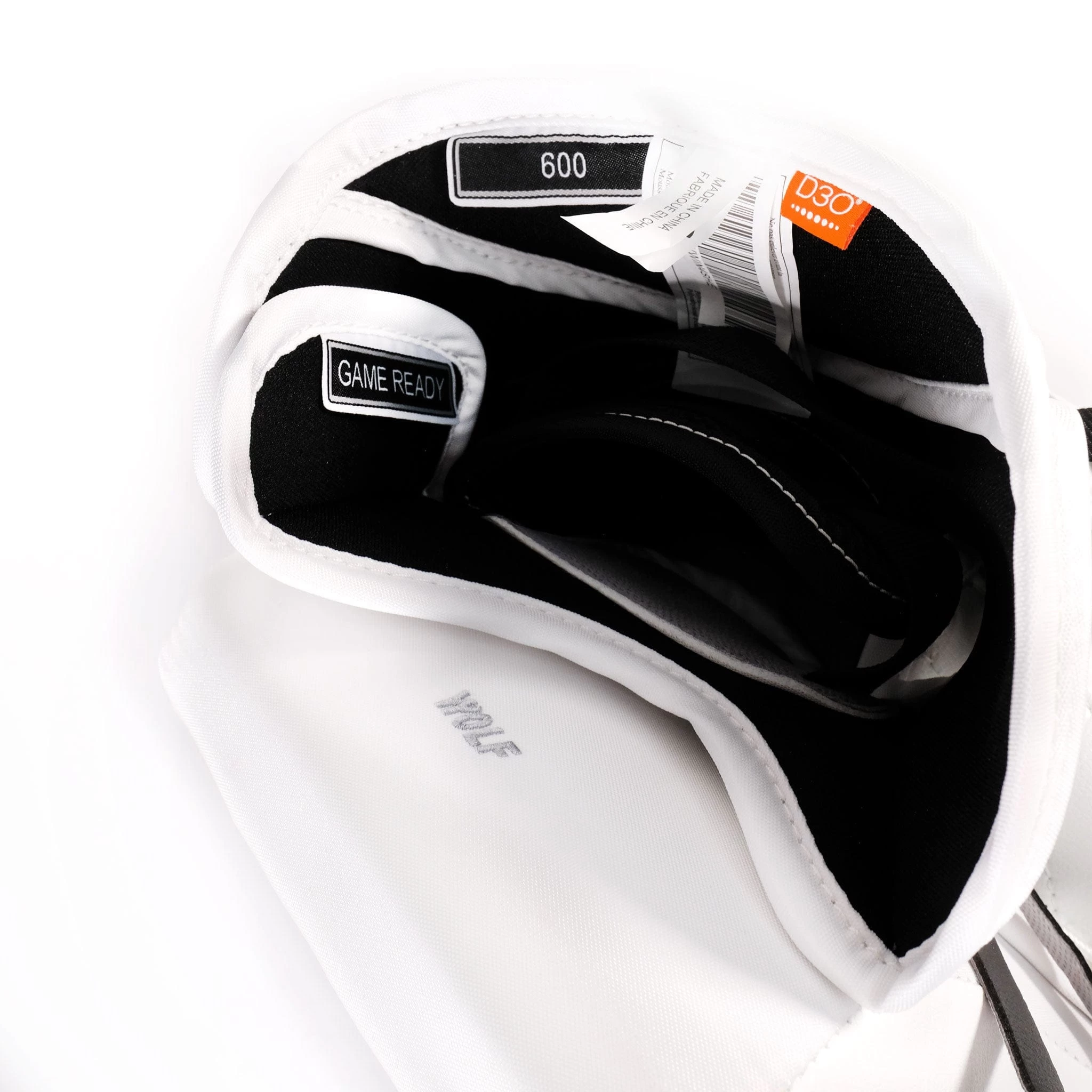 The mainly Jenpro exterior is a popular choice used by many goalies on their gear due to its lightweight feel and durability. The single tee offers greater puck feel while the puck enters the pocket of the glove. Rounding out this pro stock glove is the custom silver “WOLF” embroidery on the inside of the cuff.Â