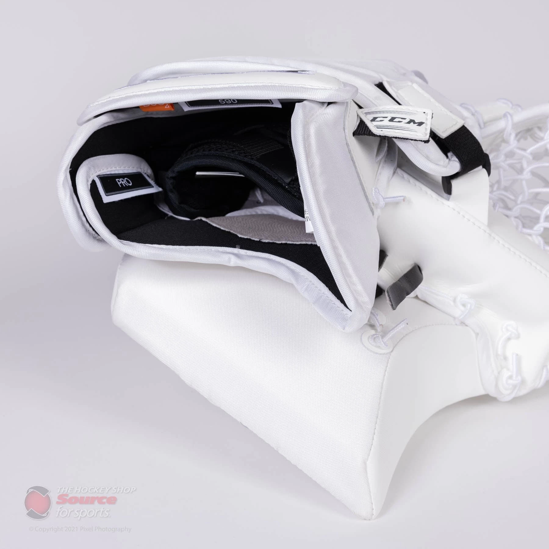 The back hand of the CCM EFlex 5 Trapper features velcro adjustments for the fingers, as well as the back of the hand. Goalies can also customize their fit by the quick release webbing strap on the wrist, which allows for easy and secure adjustment.