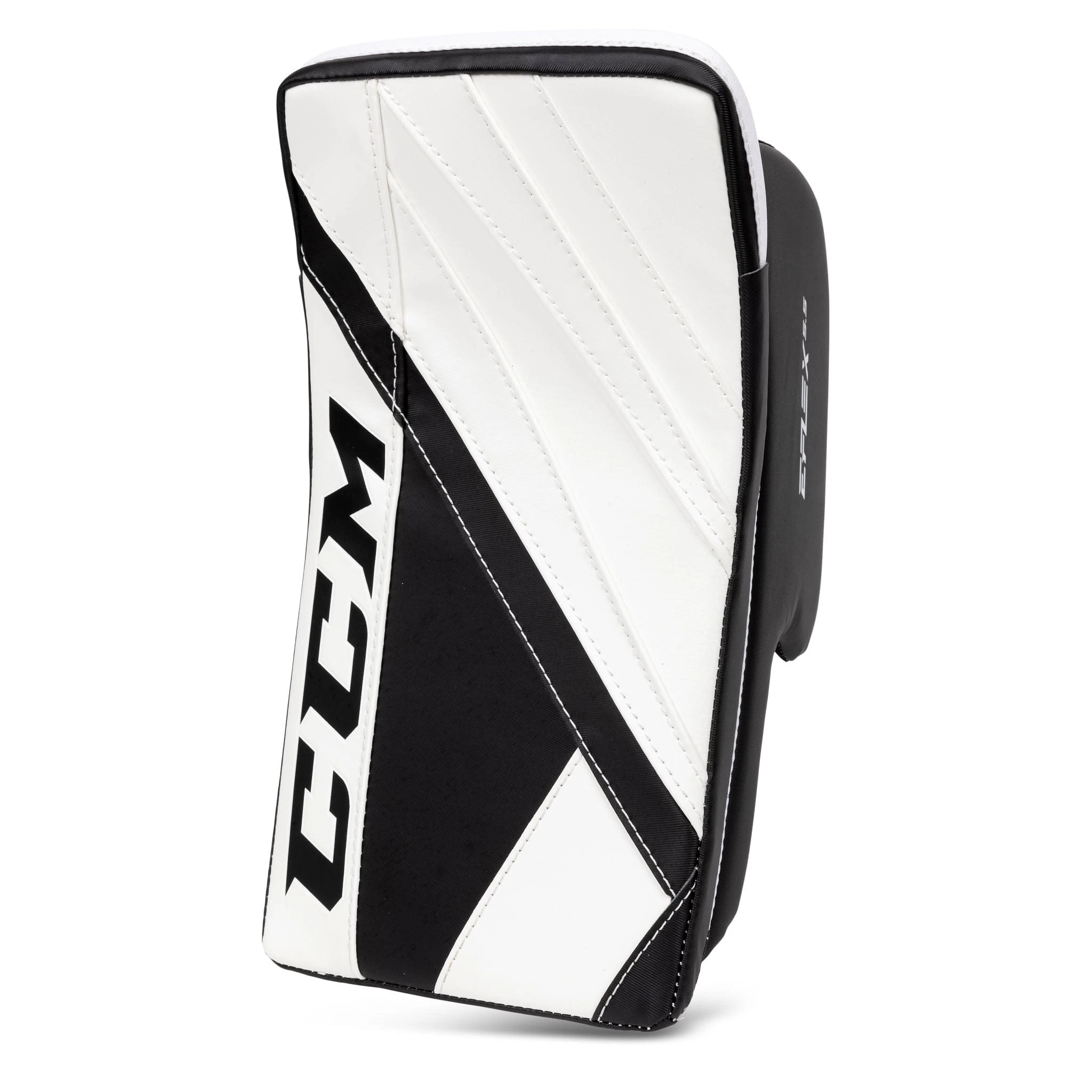 The Source for Sports Exclusive version of the CCM Extreme Flex E5.5 Junior Goalie Blocker offer a slight variation in color styling from the catalog E5.5 models. Colors offered in the CCM E5.5 Source Exclusive Blocker are; Boston, Chicago, Toronto, All Black, All White, White / Black, and White / Black / Silver. The E5.5 SDC Blocker is available in Regular and Full Right hands.