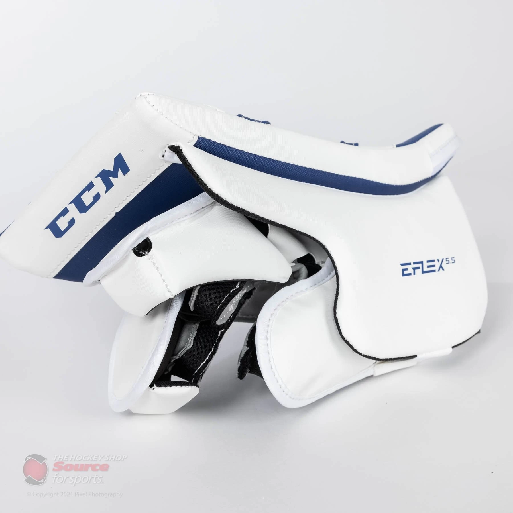 The CCM Extreme Flex E5.5 JR Blocker continues the legacy of the popular Extreme Flex line. The fifth E-Flex rendition from CCM brings new technologies to a winning design. A mobile FlexMotion cuff in a lightweight, balanced package makes the E5.5 a great option for goalies.
