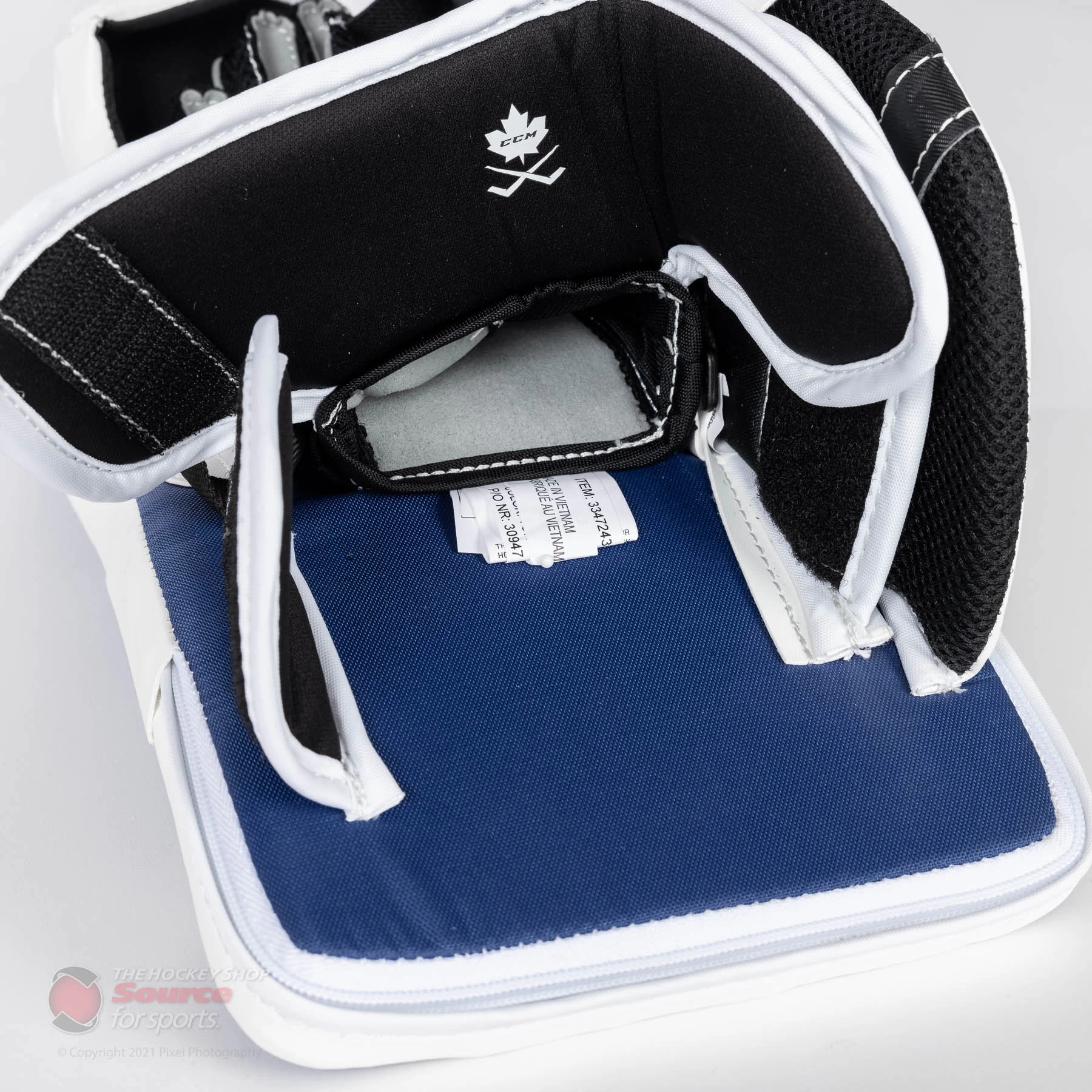 The CCM E5.5 blocker is wrapped in CCM’s proprietary SpeedSkin material. SpeedSkin on a blocker doesn’t have the same slide benefit as it does on pads. However, it is a lighter material than traditional Jenpro, and keeps the material consistent throughout a goalie’s entire setup.