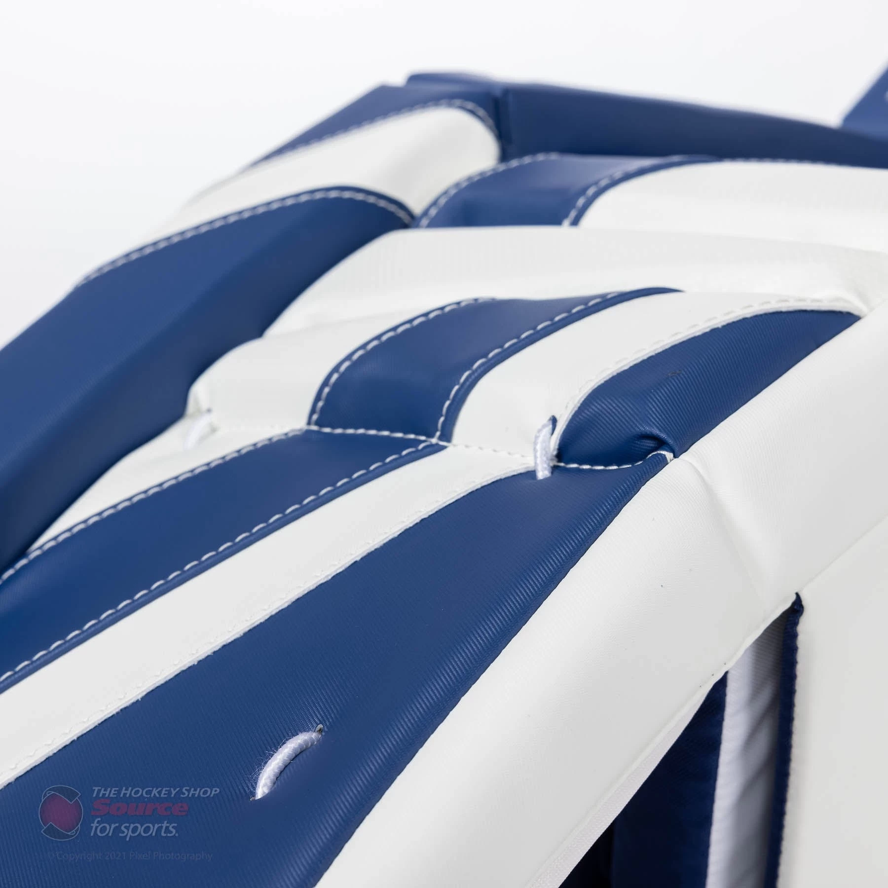 The CCM E-Flex E5.5 goal pad is wrapped in CCM’s SpeedSkin material. SpeedSkin is an embossed synthetic material that allows for an easier glide along the ice versus traditional Jenpro.