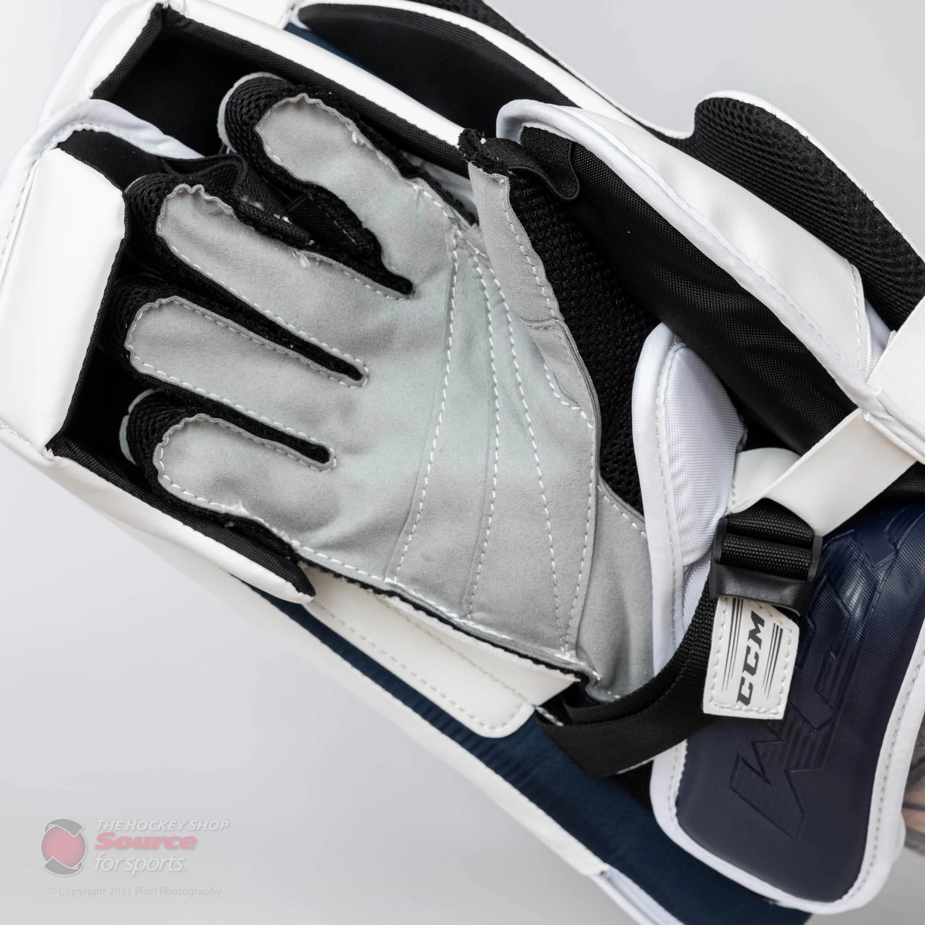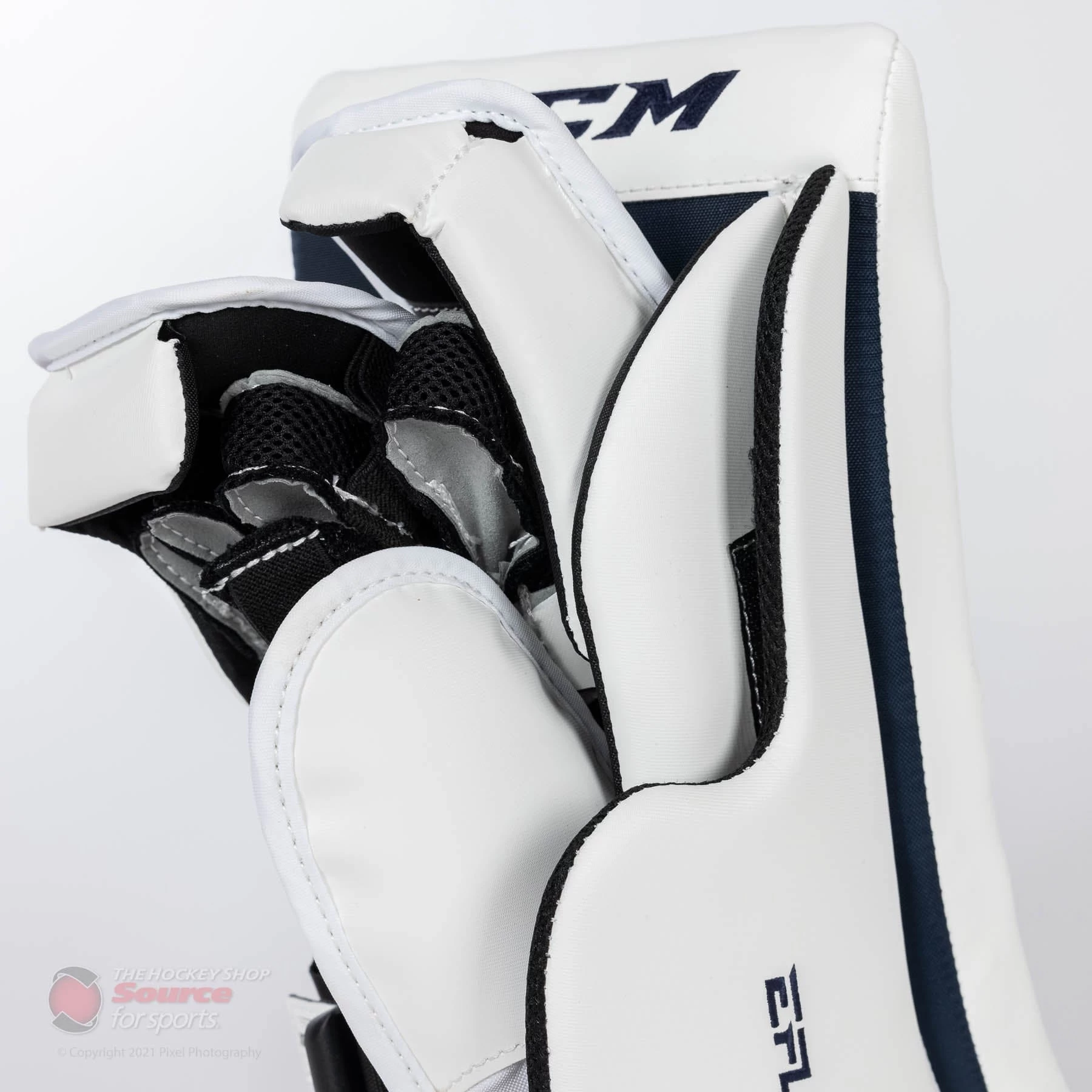 The CCM E5.9 blocker is wrapped in CCM’s proprietary SpeedSkin material. SpeedSkin on a blocker doesn’t have the same slide benefit as it does on pads. However, it is a lighter material than traditional Jenpro, and keeps the material consistent throughout a goalie’s entire setup.