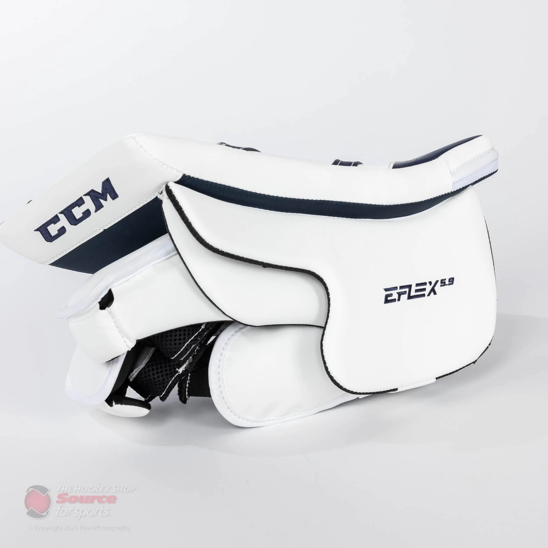 The CCM Extreme Flex E5.9 Intermediate Goalie Blocker is a stock only color offering, available in a the following colorways; Boston, Chicago, Detroit, Montreal, Toronto, All White, White / Black, and White / Navy. The E5.9 Blocker is available in Regular and Full Right hands.