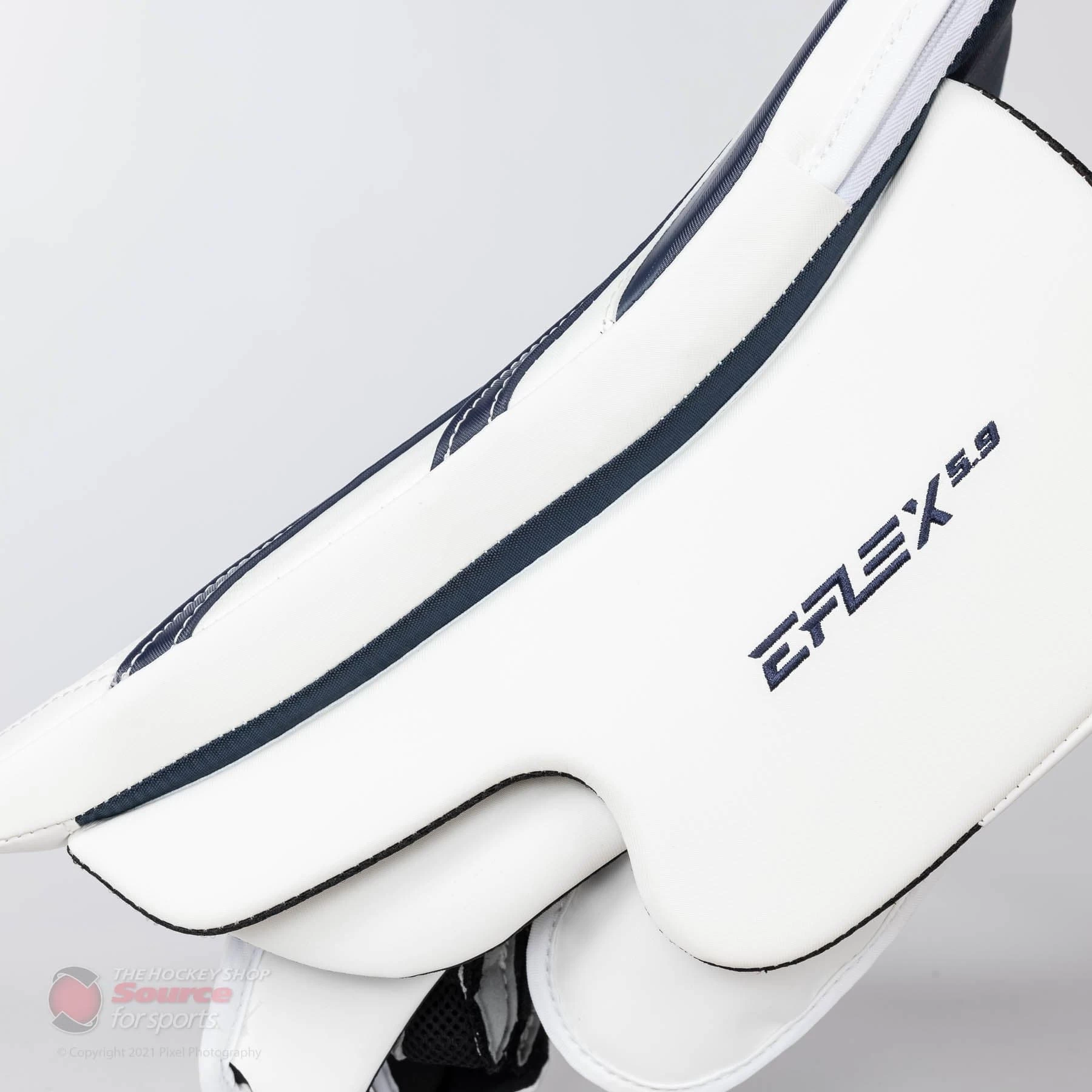 The adjustable FlexMotion cuff on the E5.9 gives goalies ample mobility, while the velcro cuff allows goalies to customize their fit.