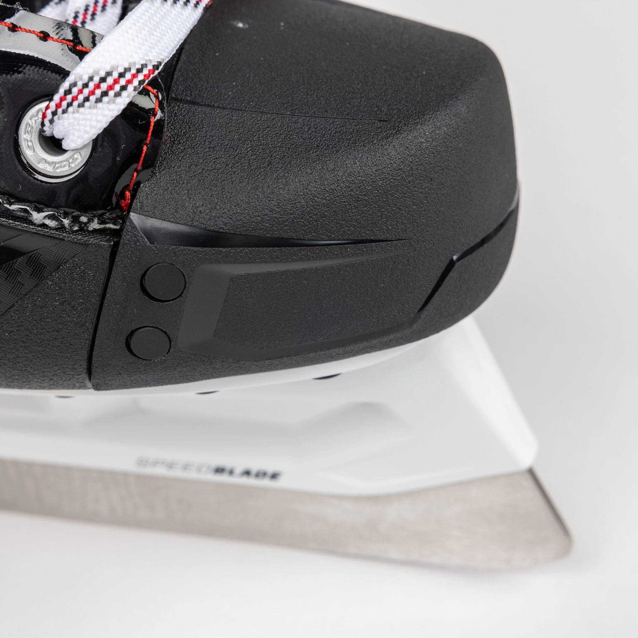 The skates use CCM’s quick-release Speedblade XSG holder with a bladelock system, coupled with CCM’s XSG 10F27. This steel is built to provide a long-lasting edge for sustained performance, and the new 10F27 profile encourages a forward-leaning and more aggressive goalie stance.