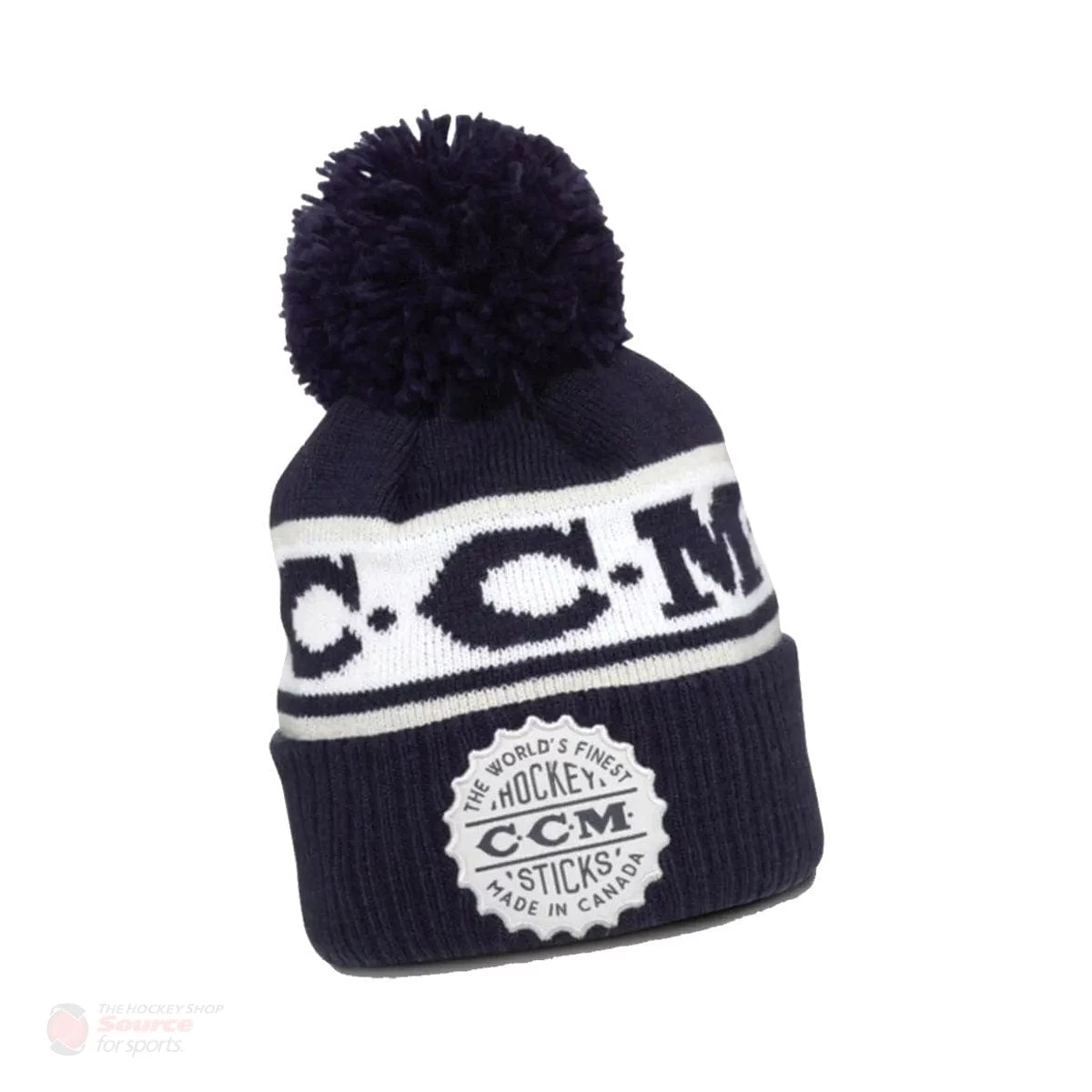Cuffed knit with striping, a soft polar fleece lining and topped with a chunky multi-color pom.