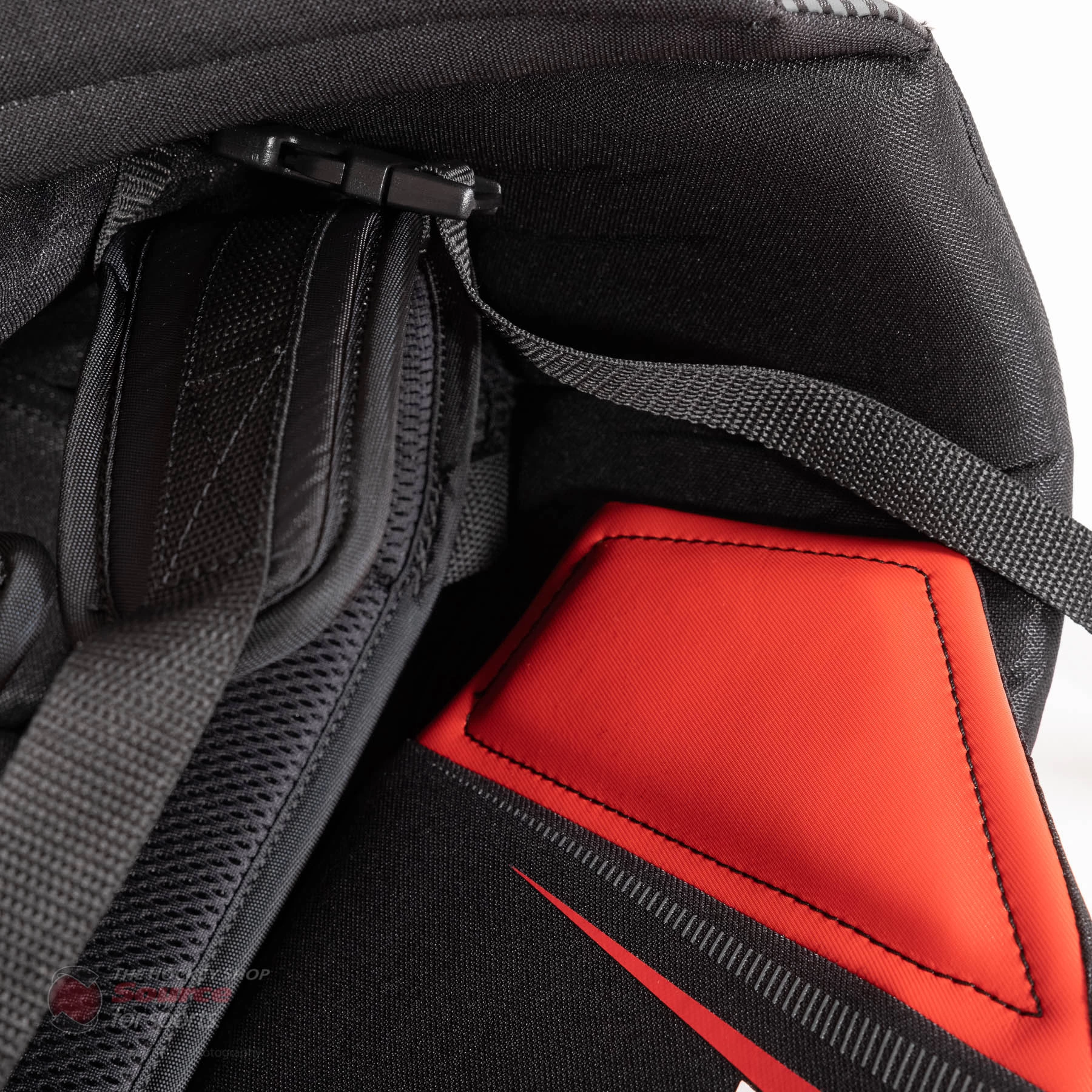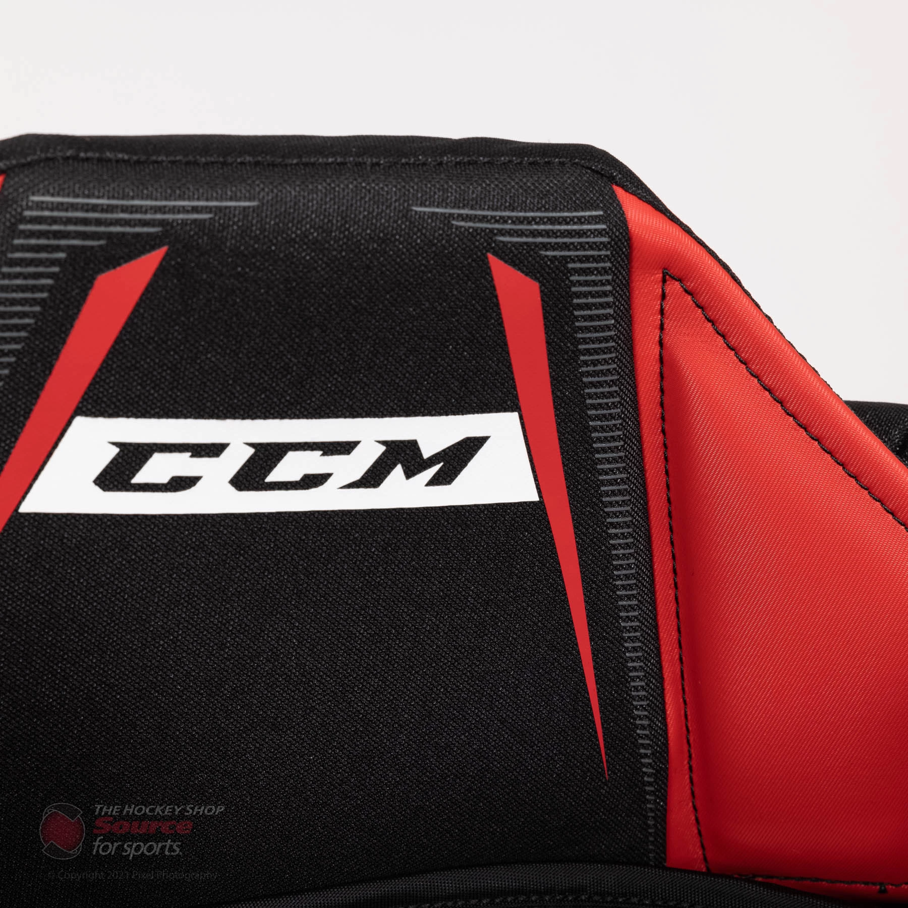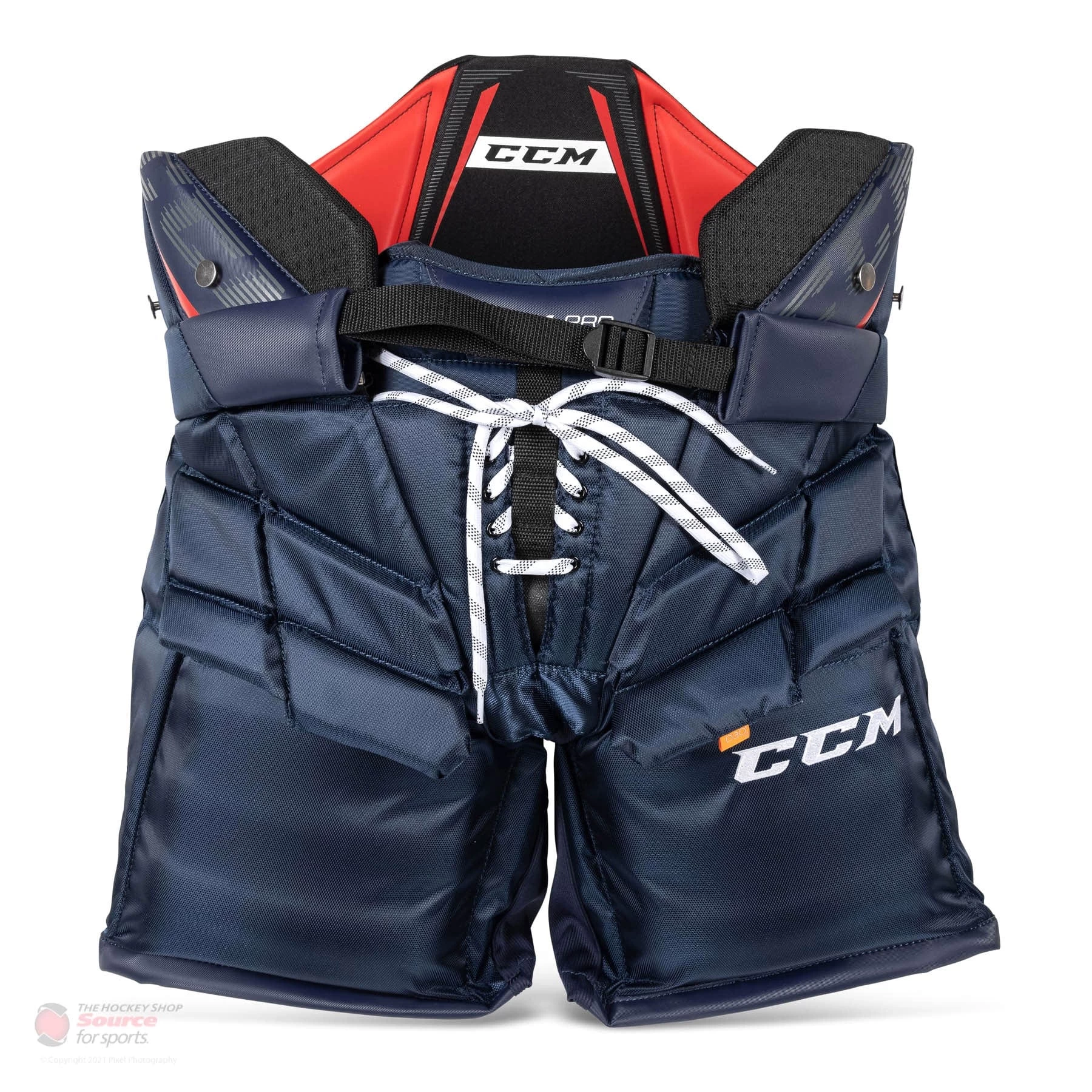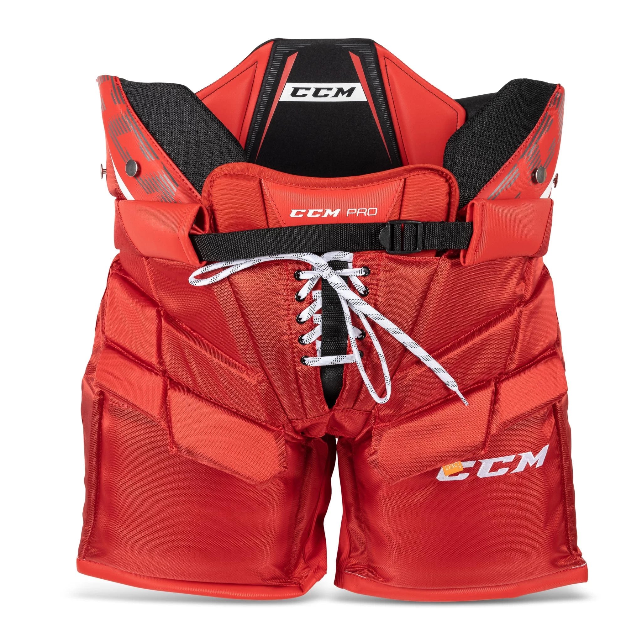 The CCM Pro Senior Goalie Pants are available in senior sizes Small through Extra Large, and in colours Black, Navy and Red.