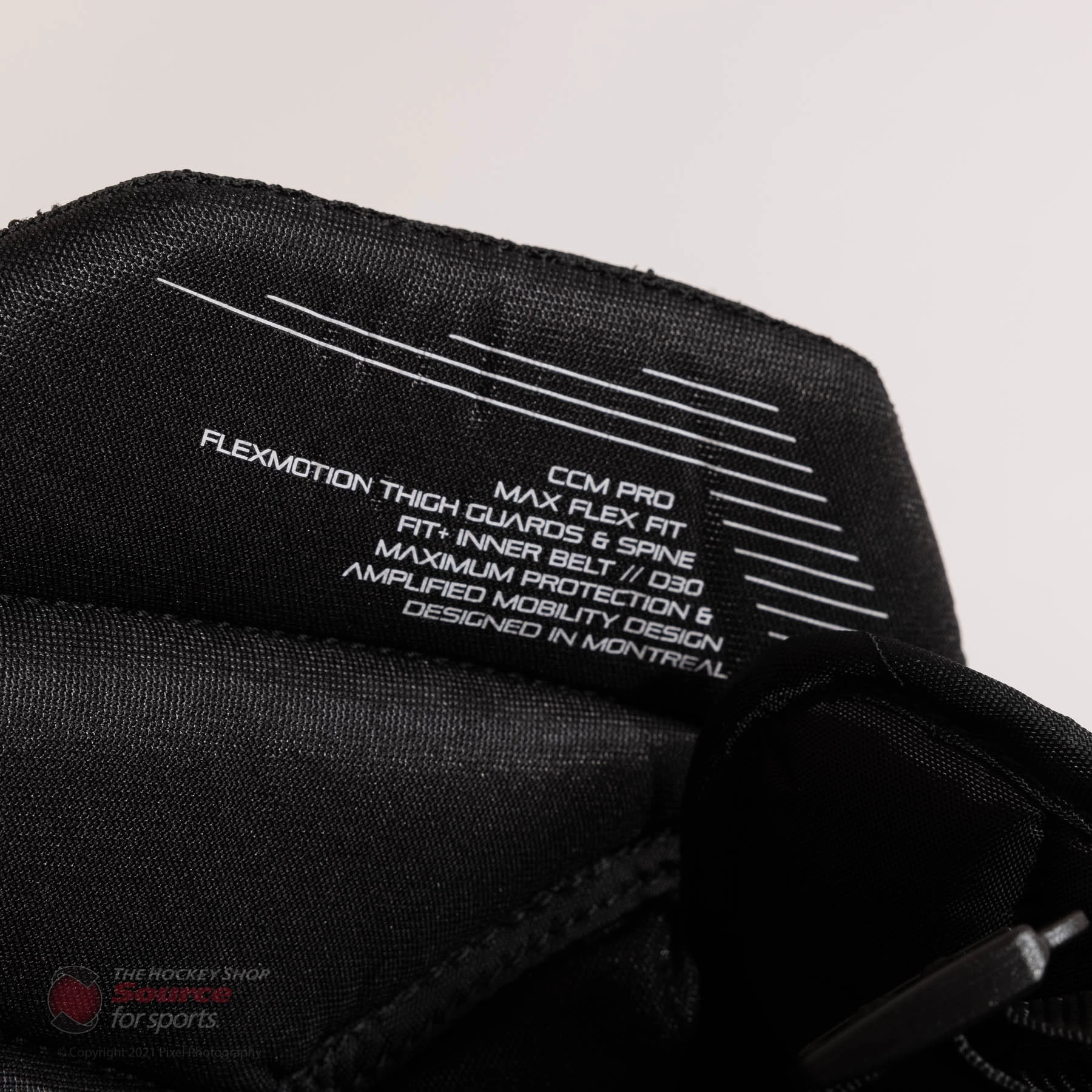 The CCM Pro pant features a wider, barrel fit with Max Flex Fit Technology. The fit profile of the Pro makes tucking the chest protector easy, though it works just as well untucked. Max Flex Fit technology refers to the flexible zones added in key areas, that allow the pant to be mobile while maintaining coverage.