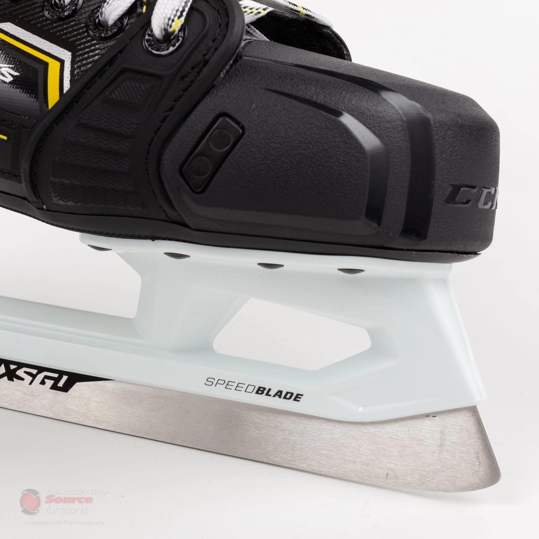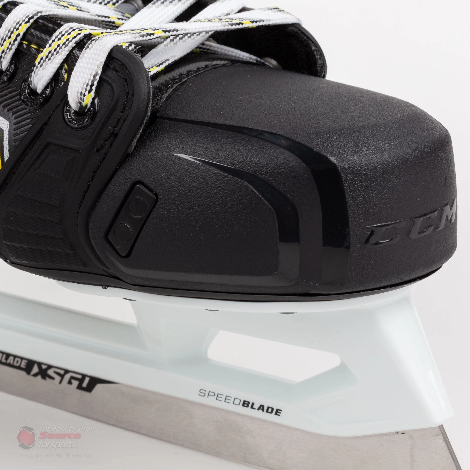 The Tacks 9380 skates feature a glossy exposed composite quarter with white CCM branding as well as yellow, grey, black and white accent stripes giving the skate a sharp look setting them apart from the rest.