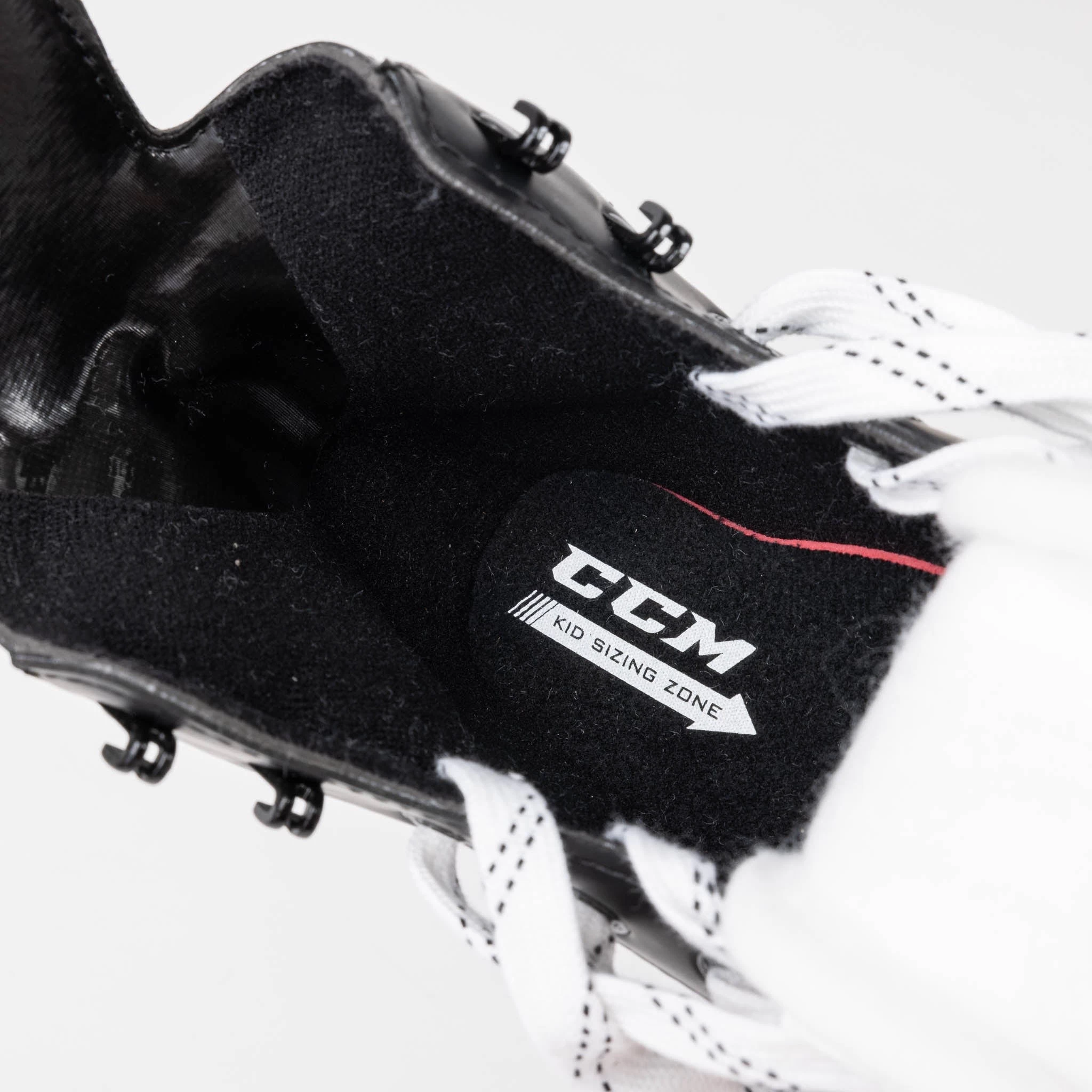 On the Junior and Youth variations, CCM put a major emphasis on the overall look and colour customization to increase kids’ retention and enjoyment of the game while they skate. The resulting look keeps the text logos and cybernetic look on the sides in a mostly grey—rather than gold—colouration. Kids can then use coloured stickers specific to the skate to decorate the sides in whatever colour they want. The decals also include number customization.