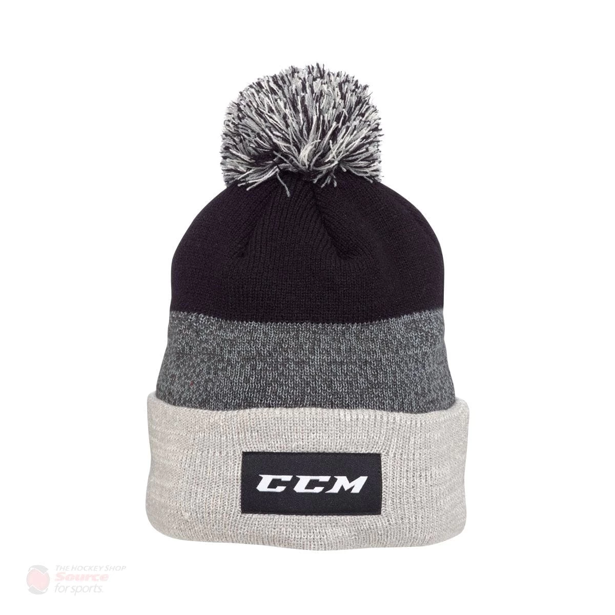 Cuffed knit hat with ribbing and a soft polar fleece lining. Features a striped design and chunky multi-color pom.